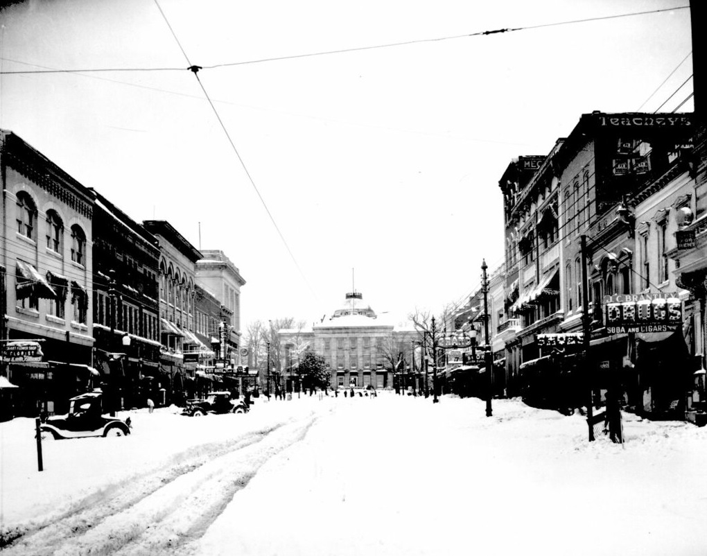 Looking north on the 100 block of Fayetteville Street (Raleigh). Photographer: Albert Barden. Snowfall amounts included: Asheville, NC: 7.1"; Charlotte: 13.3"; Columbia, SC: 0.7"; Fayetteville: 24.0"; Greensboro: 20.0"; Lynchburg, VA: 2.7"; Nashville: 2.7"; Norfolk: 11.0"; Raleigh: 17.8"; Richmond: 1.3"; and, Washington, DC: Trace