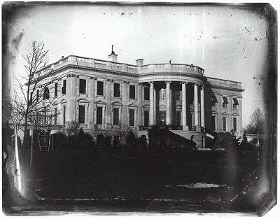 Daguerreotype of the White House with a patch of snow in the foreground (c. 1846)