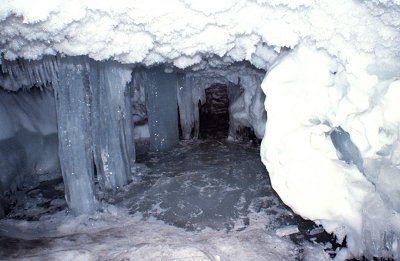 Ice stalactites, columns of ice, refrozen floor of cave, and ice crystals