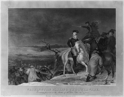 Print shows General George Washington on horseback watching as soldiers cross the Delaware River prior to the attack on the British at Trenton, New Jersey. Painted by Thomas Sully ; etched by William Humphrys ; engraved by George S. Lang.