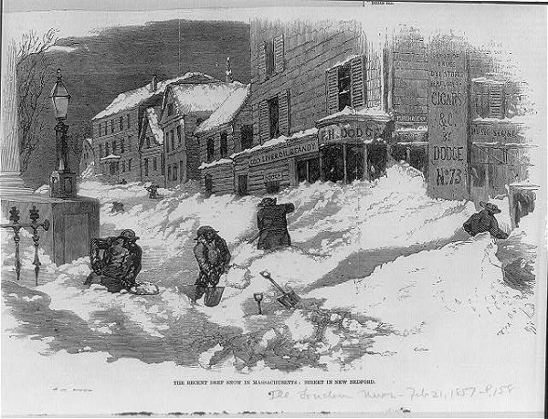 The recent deep snow in Massachusetts (New Bedford, Massachusetts). The blizzard, accompanied by "intense cold," brought a general 1-2 feet of snow in the Middle Atlantic and New England regions. Washington, DC, Baltimore, Philadelphia, New York City, Boston, and Quebec City all received a foot or more of snow.