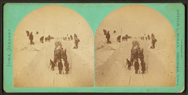 Clearing the track, showing "cut" through the drift, 12 to 15 feet deep (Decorah, Iowa)--Publisher: A. L. McKay
