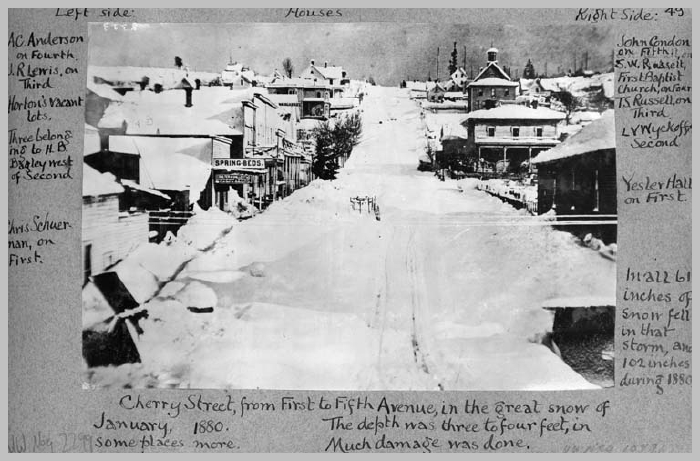 Yesler's Wharf after a blizzard, January 1880 (Seattle). Seattle's record snowstorm began on January 5, 1880. Eight days later, the snow was a record 5 feet 4 inches deep. In this photo, the snow covers the rooftops, ship spars, and hillsides. The owner of the wooden building in the center tried to prop up his building with poles, but the snow was so heavy that the roof collapsed.