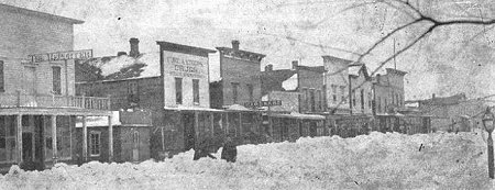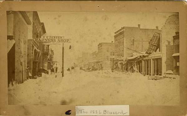 Photo Caption: The west side of Main Street looked like this after a blizzard in November 1886, with snow piled high in the street. The picture was taken from the corner of Main and Third streets, looking north. First building was the office of the Odebolt Reporter, then the Hess barber shop, Curt A. Stoops drug store and Sutton's hardware. The sixth building now houses the Ellis barber shop and billiard parlor, others in the block include the building of Sampson & Son, now occupied by Nelson's Variety store, and Ballard's meat market. Corner building was the Ketterer hardware store, while the C.A. Burnquist store was on the opposite corner, where the First National bank building now stands ("Fifty Years of Progress," Odebolt Chronicle, August 25, 1938). Accumulations included 5.7" at Des Moines; 11.2" at Minneapolis; and, 13.6" at Omaha.