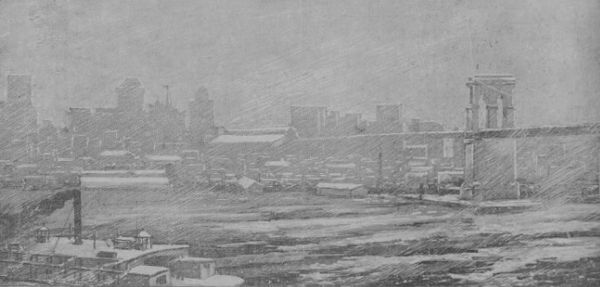 Ice floes in the East River and the Bridge [Brooklyn Bridge] in blizzard garb (New York City)