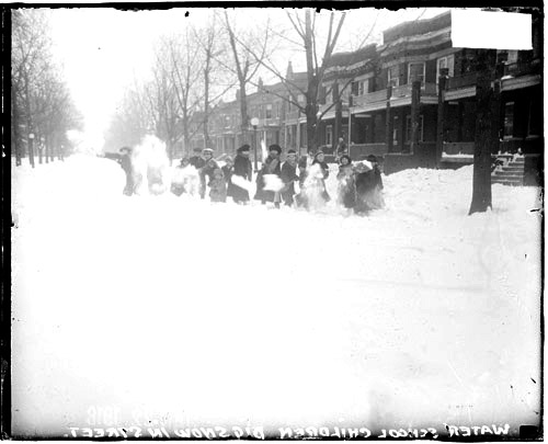 Children from Water School (located at 2519 West Wilson Avenue) shoveling snow on a residential street in the Lincoln Square community area of Chicago, Illinois
