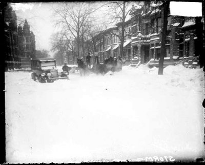 Automobile stuck in the snow on a residential street in Chicago, Illinois. A man driving a sled with three or four horses is pulled up next to the automobile. The storm dumped 14.9" snow in Chicago, 7.9" at Green Bay, and 19.5" at Milwaukee.