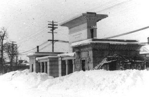 The Egyptian Revival Gateway at Mount Auburn Cemetery (Cambridge, Massachusetts) on February 4, 1926. The snowstorm dumped 10.4" snow in New York City and 12.9" in Boston.