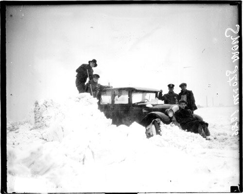 Four civilian men and one policeman standing by an automobile stuck in the snow during a snowstorm (Chicago). Accumulations included: chicago: 12.6"; Des Moines: 5.0"; and, Milwaukee: 13.6"