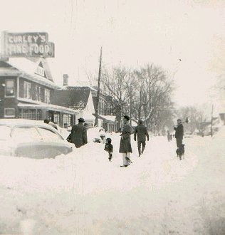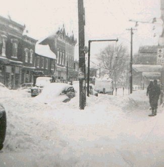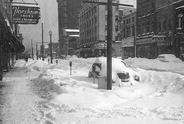 Looking southeast on Main Street in Alliance after the big snow storm of November 25,1950. Photograph shows Klein and Roderick Men's Store, and Sears on the south side of the street and Allott's, Turner's Drugs, Francis Jewelry, Lexington Hotel, Peter Pan, Islay's Ice Cream Store, Jean Shop, Kingdom Hall, Lindesmith's Hardware, and Gail's Dress Shop on the north side of the street. (Alliance, Ohio)