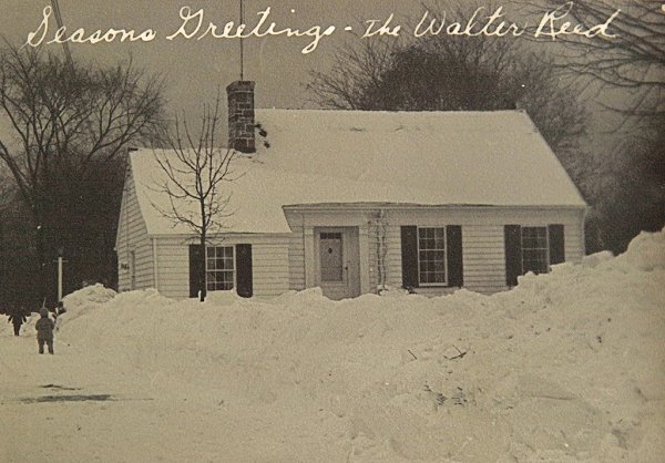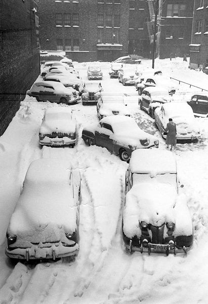 Scene during the great snowstorm of November 25, 1950 showing snow-covered vehicles in parking lot off Linden Avenue. Also shown is entrance to Alliance Recreation. (Alliance, Ohio)