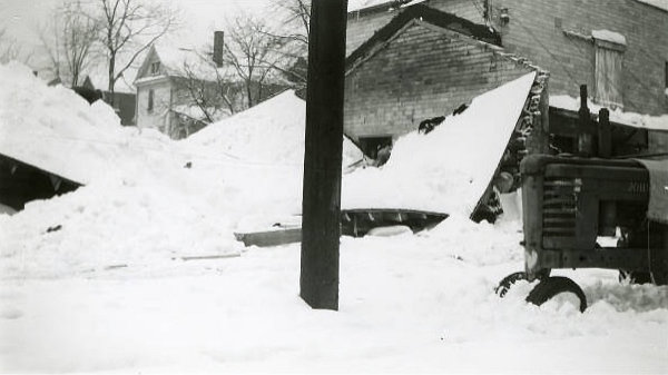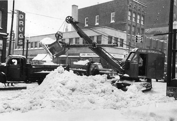 After the big snow storm of November 25, 1950, showing Leroy Irish snow removal equipment removing snow from the corner of Arch Avenue and Main Street. (Alliance, Ohio)