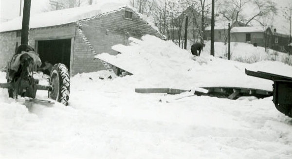 An unidentified man works on the damage done to Linerode's Fee Mill after the roof collapsed from the weight of the "Big Snow" of 1950. This is the south end of the building, taken from the east side. (Alliance, Ohio)