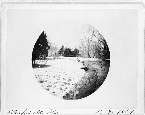Franklin Square (Washington, DC). The photographic print following the snowstorm was made by Uriah Hunt Painter on April 9, 1889. Washington, DC received 4.0" snow.