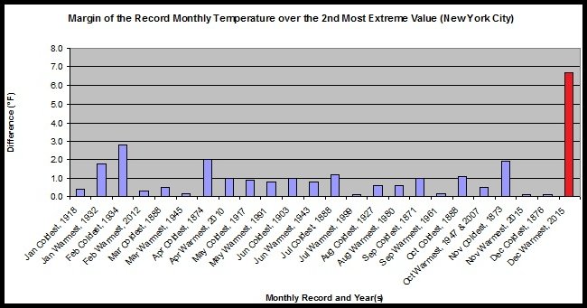 December 2015 was 6.7°F/3.7°C warmer than the previous warmest December on record. As of the end of December, no other month has such a large difference between its most extreme cold or warm value and its second most extreme respective value.