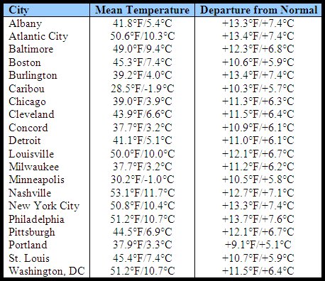 On account the combination of a super El Niño and a predominantly positive Arctic Oscillation, a large part of North America and Europe experienced an exceptionally warm December. In parts of North America, including the New York City area, the magnitude of warmth was historic when compared with past records. Its 50.8°F/10.4°C average temperature was, by far the highest on record for December and would have edged 1999 for the 9th warmest November on record.