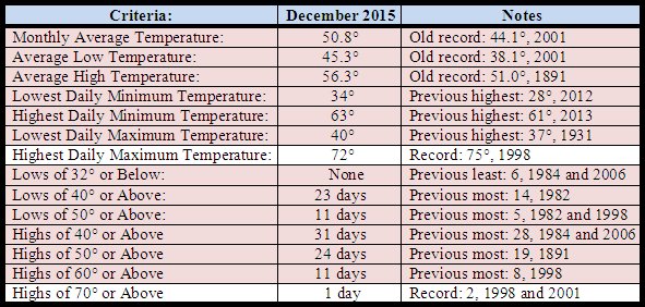 In addition, for the first time on record, December had no days on which the temperature fell to 32°F (0.0°C) or below. The previous fewest days on record for December was 6 days. That record was set in 1984 and tied in 2006. The 11 days on which the low temperature was 50°F/10.0°C or above tied the record for November.