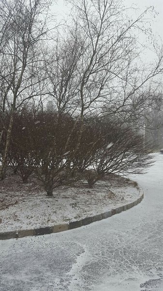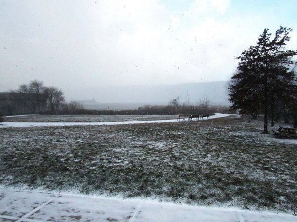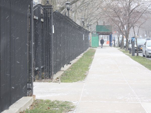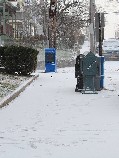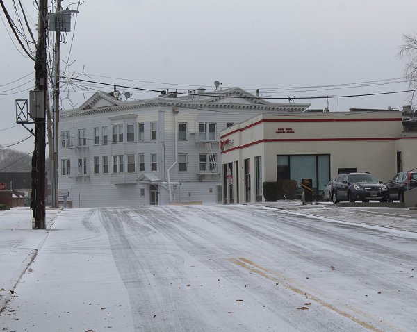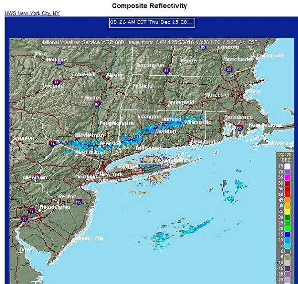 Radar image of the snow squall heading southward. Snowfall amounts included: Islip: 0.1"; New York City: Trace; and, Newark: 0.1"