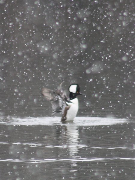 A Hooded Merganser during the snowfall (Larchmont, New York)