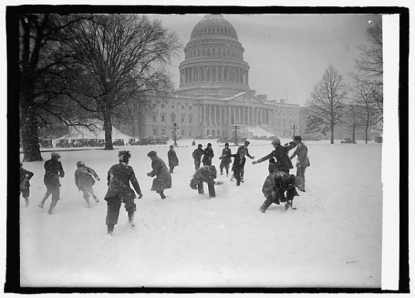 Senate pages in a snowball battle at the U.S. Capitol (Washington, DC). Snowfall amounts included: Boston: 2.0"; New York City: 11.5"; Philadelphia: 6.7"; and, Washington, DC: 7.5"