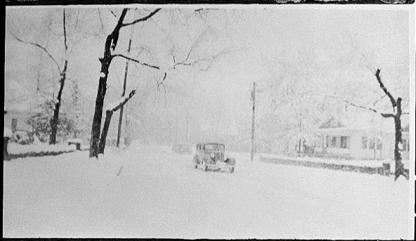 Calhoun, Jan. 1940. View of the 500 block of College Street during snowstorm which deposited over 10 inches of snow on the town. At right the home of Frank Dobbs can be seen (Calhoun, Georgia). Snowfall amounts included: Athens, GA: 9.8"; Atlanta: 8.3"; Augusta, GA: 0.7"; Baltimore: 6.0"; Birmingham, AL: 9.5"; Dahlonega (4 WSW): 12.5"; Farmville, VA: 24.0"; Fayette, AL: 14.0"; Louisville, MS: 15.5"; Macon, GA: 3.0"; Nashville: 4.9"; New Canton, VA: 24.0"; New York City: Trace; Norfolk: 5.8"; Philadelphia: Trace; Richmond: 21.6"; Valley Head, AL: 14.0"; and, Washington, DC: 9.5"