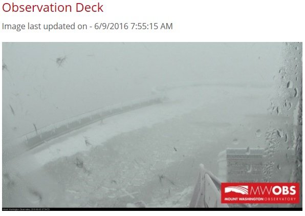 Mount Washington Observation Deck. Total snowfall came to 1.8" (June 8: 0.3" and June 9: 1.5"). The June 9 snowfall figure broke the daily record of 0.5" from 1980.