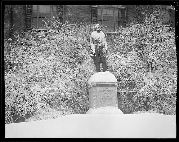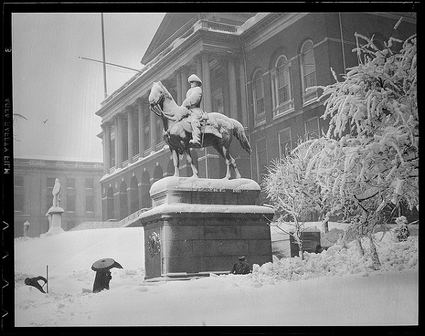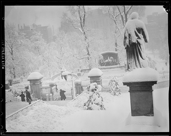 State House grounds in the snow (Boston) -- Photographer: Leslie Jones.