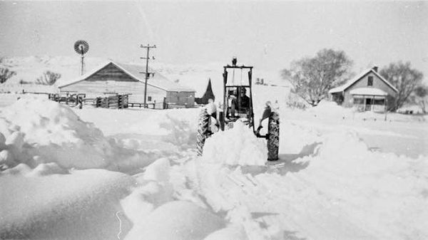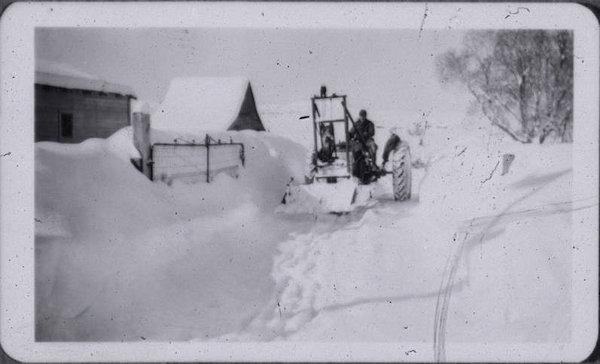 Man clearing snow with a tractor after historic snowfall of 36 to 40 inches (Franktown, Colorado). Snowfall amounts included: Denver: 30.4"; Edgewater: 30.5"; Estes Park: 33.0"; and, Haswell: 32.0"