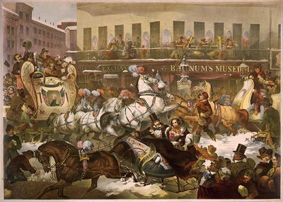 Sleighing in front of Barnum's Museum, Broadway and Anne Street(?), New York (T. Benecke, c.1855)
