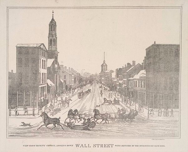 View from Trinity Church, looking down Wall Street with sketches of the buildings on each side. And the heights of Brooklyn (Artist: Hugh Reinagle and Lithographer: Peter Maverick). The illustration was made around 1834.